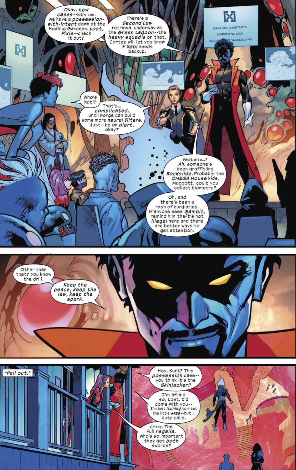 It is here that we come upon Polaris, Shiro, Omega Red and Kurt. Each of them look exactly as you probably saw them last – if you’ve been currently keeping up on the Krakoan Era of X-Men Comics – unless you are thinking about what Lorna or Sunfire’s have begun sporting new costumes since the Fall. They are also two individuals who, while often rejecting previous membership offers, ended up serving on the first X-Men team of the Krakoan Era. Meanwhile, Arkady has been one of Krakoa’s most successful rehabilitations and then there is Kurt who created a team to uphold justice on the island – despite some devils messing with his DNA.