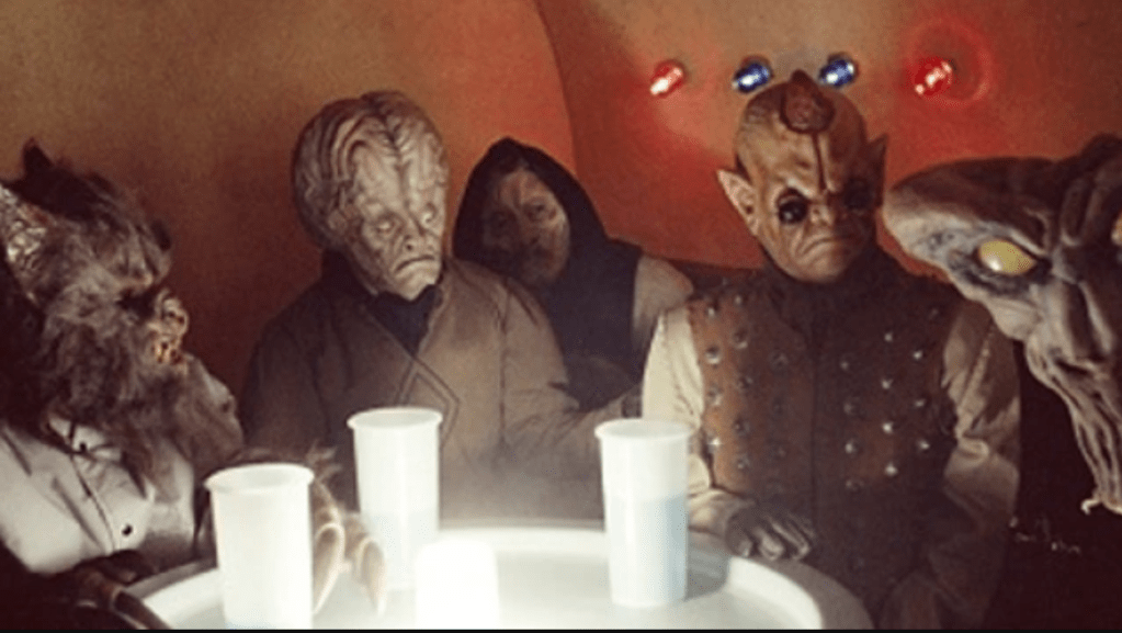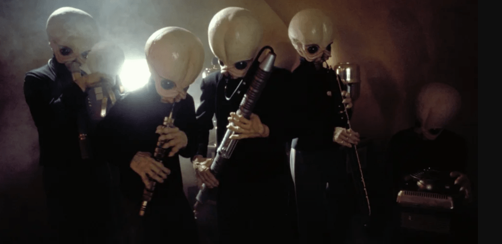 In that scene from A New Hope we first see Skywalker and Kenobi as they observe the area from a distance. Then as they approach Mos Eisley in Luke’s landspeeder, the audience – and Luke – learn from Alec Guiness’ Obi-Wan’s exactly where they are heading to find assistance with their mission. However, help would seem to be the last thing you would expect to find in Mos Eisley as, according to Obi-Wan, it is “a wretched hive of scum and villainy.” He even punctuates this by adding “we must be cautious’; advising the naive farmboy he isn’t in Kansas anymore. But clearly making it past the checkpoint without incident made Luke a little too comfortable until his run-in with Ponda serves to remind him and audiences of the Jedi’s instructions. That may be why bartender Wuher warned Luke they don’t serve their kind while looking at C3-PO; he meant civilized. Even the relaxing melody from the Modal Nodes seems to have a hidden meaning, perhaps alluding to the lead singer Figrin D’An internal struggle given the title is “Mad At Me”.