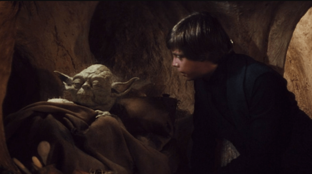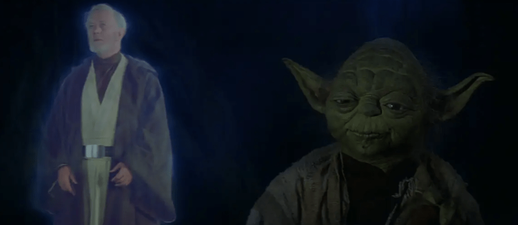 Now we all know this would not be the last time Mark Hamill’s Luke would see Kenobi. By piercing the veil, Obi-Wan exhibits a Force ability that contradicts his own Jedi master’s comment. I’m referring to Qui-Gon’s use of the word “living” as he explained The Force and midi-chlorines to a young Anakin. But when Anakin becomes Vader his loss of “humanity” hints that biology also isn’t a barrier to being One with The Force. Then is it possible that anything capable of sentience could be Force sensitive? With Yoda’s description, The Force doesn’t exist internally but is instead an external energy that “surrounds and binds us.” While he chides Luke for his small mind Yoda goes on to explain that The Force exists “even between the land and the ship.” Then the Jedi Master bows his head and concentrates, until slowly Luke’s ship emerges from the swamp, coming to rest on dry land. But pay attention and you’ll notice R2’s joyful bobble and beep begin even before it breaches the surface. Almost as if the droid senses a connection with what is occurring. You may not believe it like Luke didn’t believe what Yoda accomplished.
