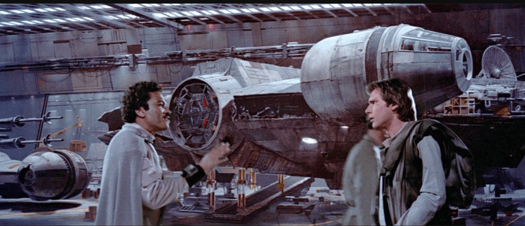 Similar to the Ewok’s interlude at the end of Jedi, what you see next has changed over the years courtesy of Industrial Light and Magic. With the benefit of special effects this interaction between Han and Greedo has been retconned resulting in a situation where the bounty hunter shoots first with Han’s (fatal) blast being retaliation. This outcome helps support Solo’s shift as he begins to see and switch sides in the larger galactic situation occurring in Star Wars. This culminates in Episode IV when Han decides to return and assist Luke during the Death Star run. The rogue is redeemed and when Harrison Ford reprises the role in The Empire Strikes Back Han is still on the side of the angels. Turning out to be Princess Leia’s only option to escape Hoth, Han manages to elude The Empire before eventually finding refuge in Cloud City. There, we are introduced to Lando Calrissian, a smuggler from Han’s past who has also seemingly changed his ways.