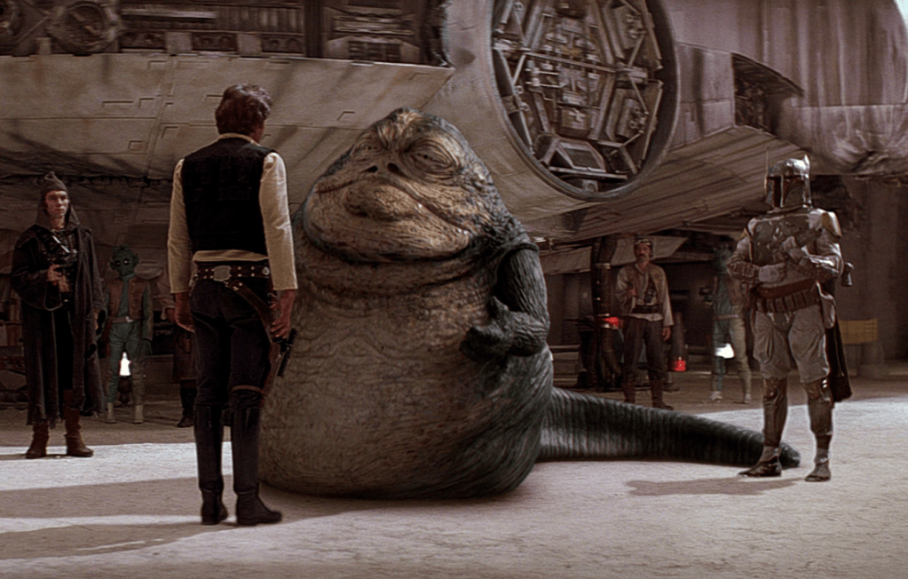 Or maybe the song is meant to reflect how Han Solo is feeling at that moment. His pockets and reputations are hurting after he had to drop a shipment of smuggled cargo during an encounter with an Imperial star cruiser. This leads to Jabba the Hutt placing a bounty on his head, or at least that is the new arrangement according to bounty hunter Greedo as he confronts the smuggler. Staring down the barrel side of Greedo’s blaster, Han weighs his options. Allow the bounty hunter to escort him back to Jabba’s palace or there was Greedo’s offer to forget he found Han in exchange for the credits Solo was promised by Obi-Wan.